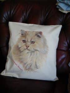 Cushion cover with transfer of a Champagne Persian Cat by Robert May.  Material 100% cotton and an envelope style cover.  Insert not supplied.